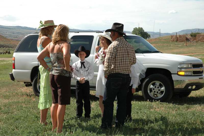 As I said before, the clans were gathering. Uncle Harold & Aunt Sharon showed up while we were out checking out the wedding site. Brett's dad, Dennis, and his daughter-in-law, Tara, took off for Guernsey Army Training Center to pick up her husband Aaron (Brett's brother) who is in the Kansas National Guard and is training there. Brett's mom, Betty, stayed behind and watched Aaron & Tara's little boy Dyllon - "Double-D". Brett's sister, Brenda Riddle and her husband James from Illinois came too. Before Friday afternoon was over, we had hamburgers & what-have-you cooked up on the barbecue and lots of friends of Brett & Susan had showed up with a very ample supply of Coors (what else does a cowboy drink?) and the pick-up truck to stand around. They were a well behaved group. An exciting moment was when the sheriff showed up looking for someone with Montana plates that was working for the local county. Guess you ain't suppose to do that. Susan tried to get them to stay awhile and have a beer, but they refused and moved on. |
